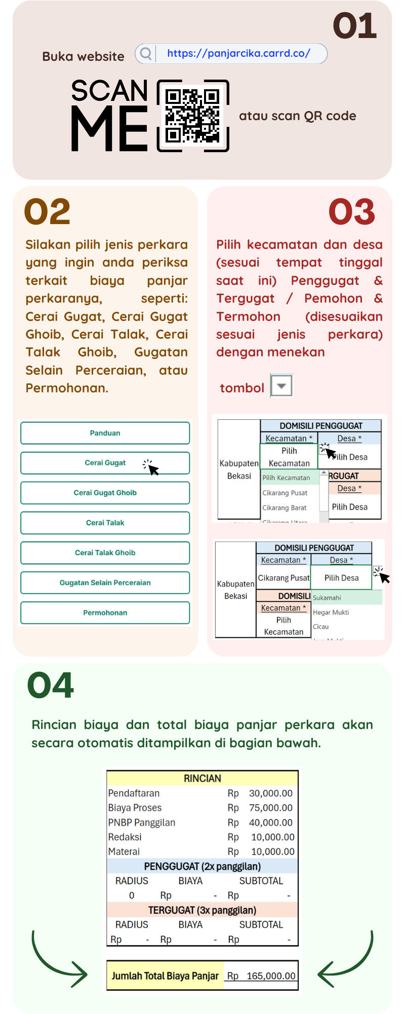 * ) Saat ini layanan cek biaya perkara hanya tersedia untuk Kabupaten Bekasi. Jika Pemohon berada di luar Kabupaten Bekasi, harap hubungi petugas meja pendaftaran untuk cek biaya panjar perkara.